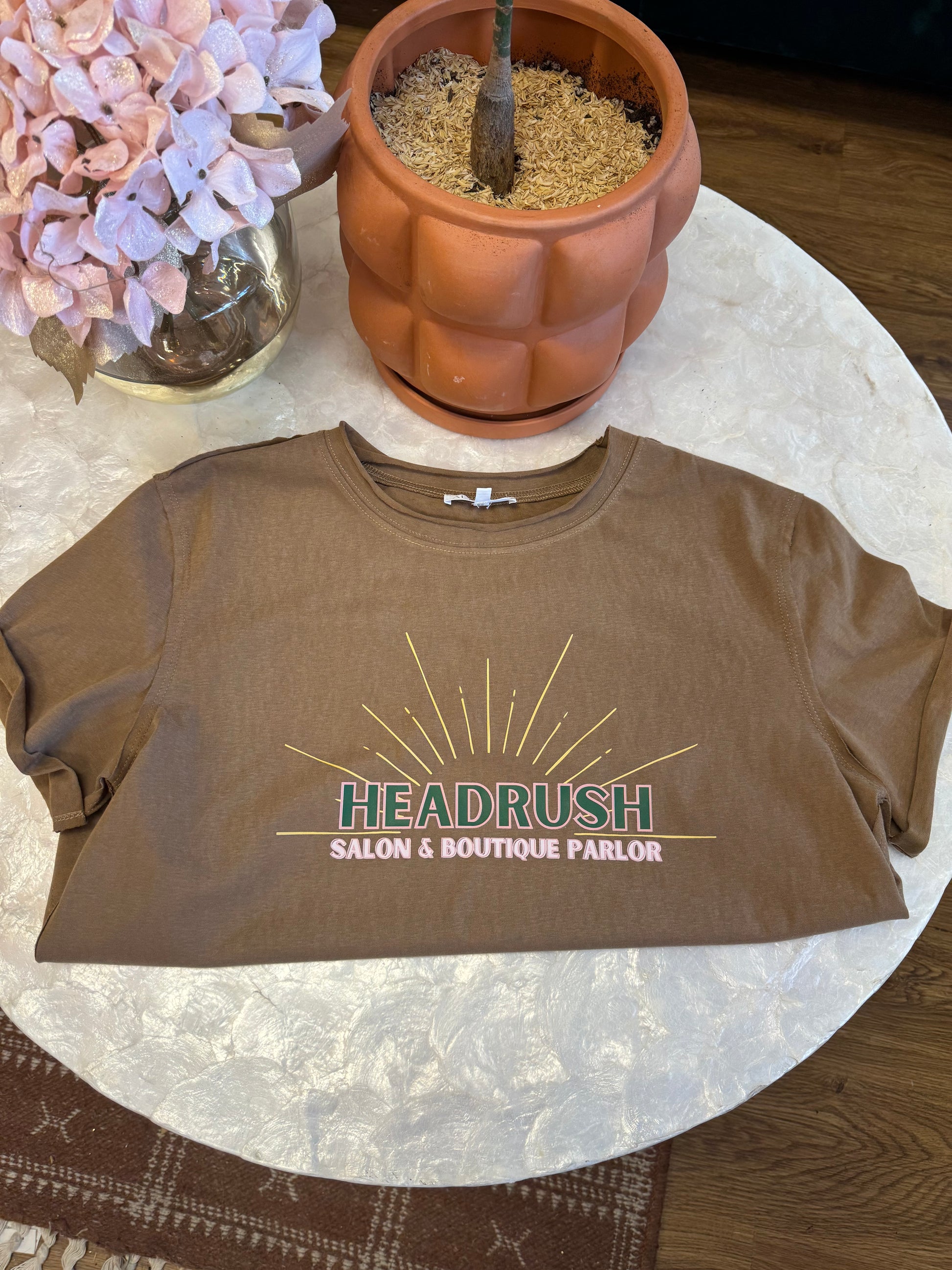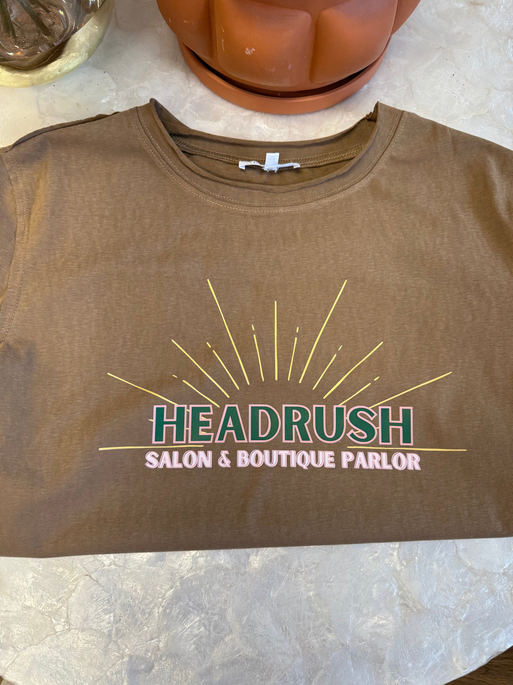 Custom Design by Danielle. Support your local Headrush Salon and Boutique with this adorable graphic t-shirt. No peeling or fading with this dtf transfer.